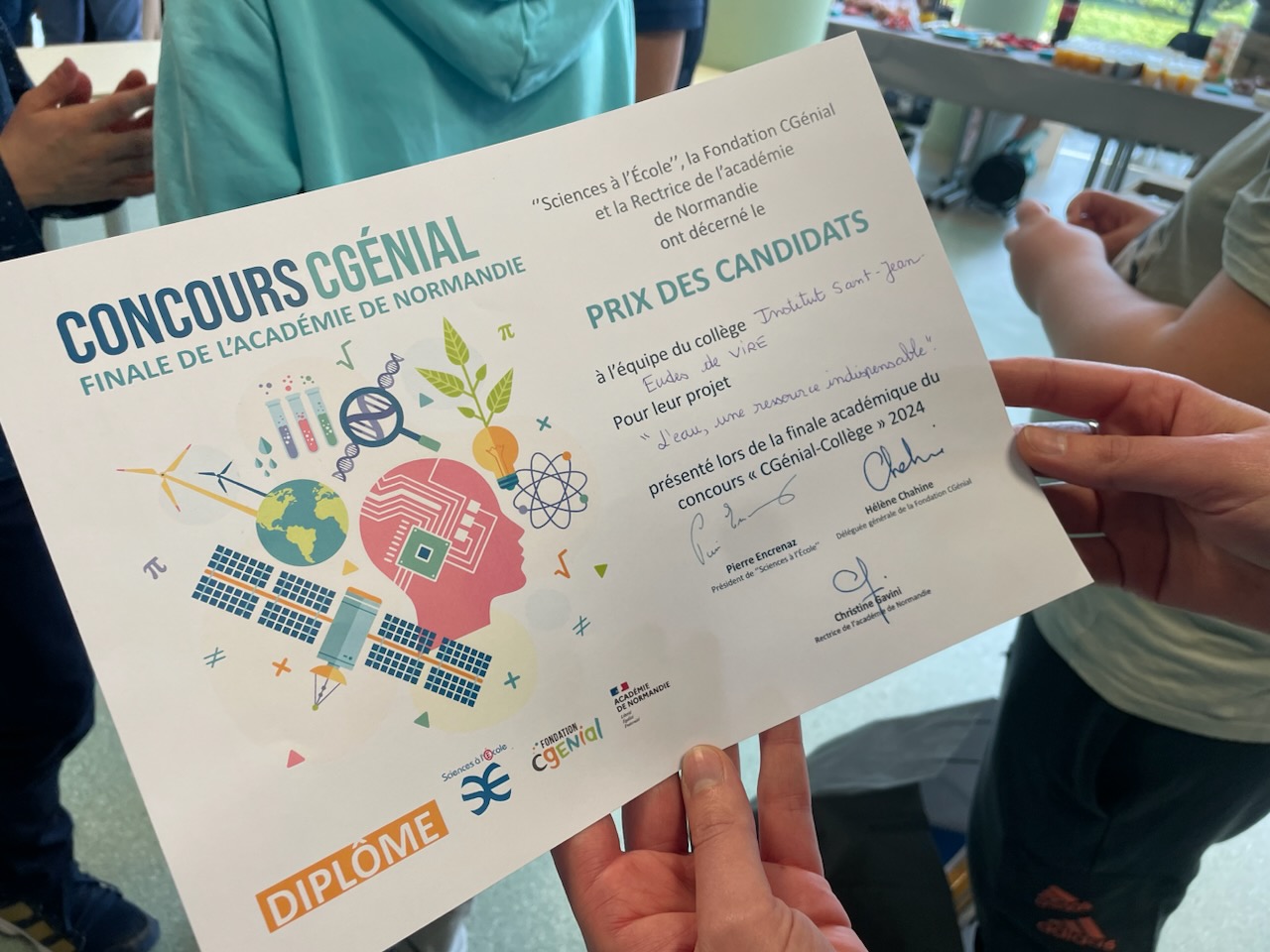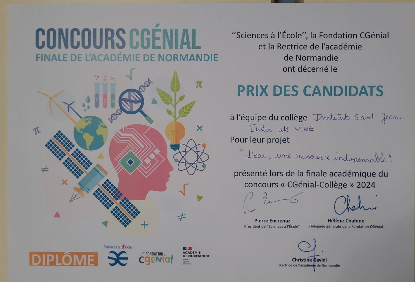 Dans le cadre du projet « Sciences à l’école » organisé par la Fondation CGénial, nos élèves de 5è ont obtenu un prix lors de la finale académique !! Bravo à eux!