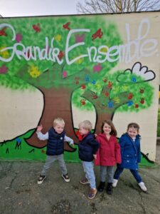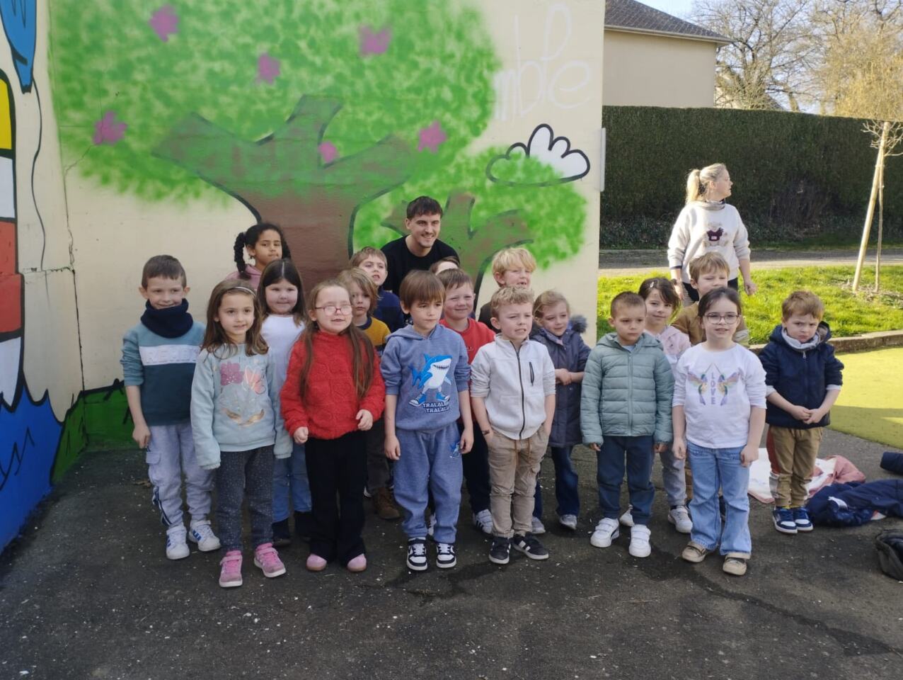 Les 65 élèves de la maternelle ont pu laisser une empreinte de leur main sur le mur avec l’artiste SOMA. Merci à l’APEL pour le financement ! Nous sommes tous ravis de cet embellissement!